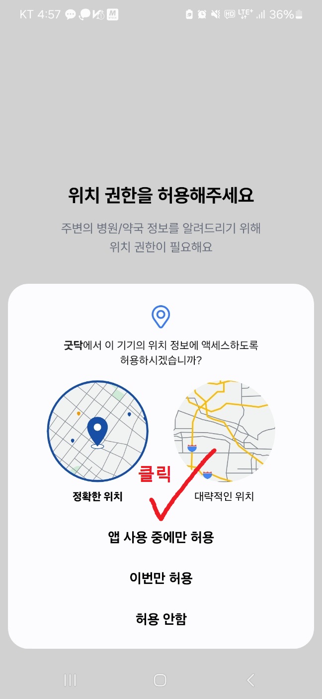 4. 위치 권한은 꼭 허용해주셔야 합니다! 그래야 현재위치 기준으로 영업 중인 약국을 찾을 수 있어요!